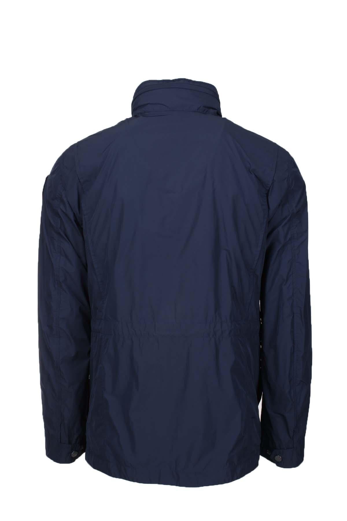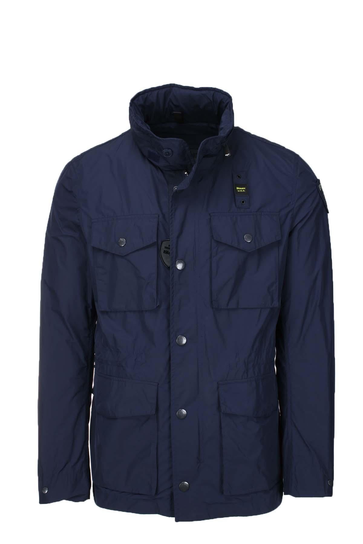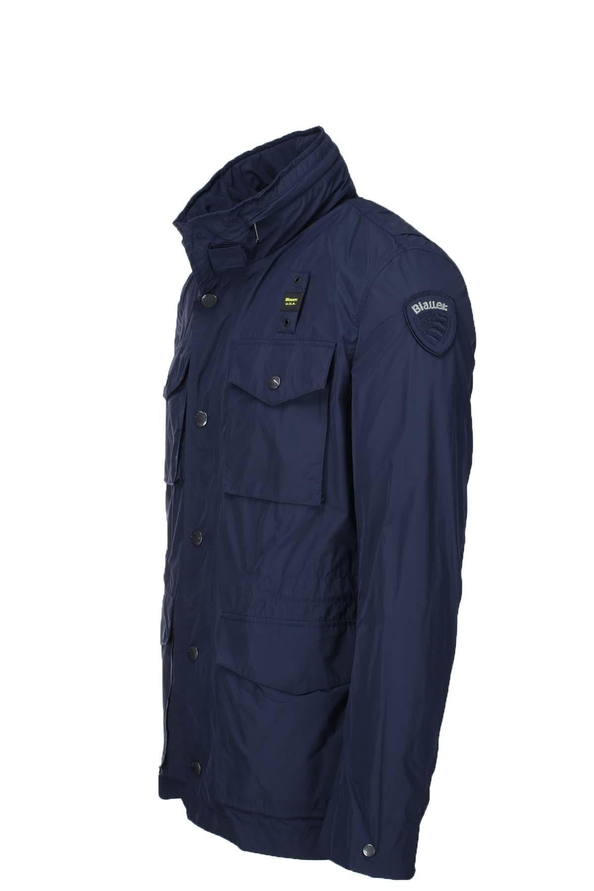 Giacca primaverile sfoderata realizzata in nylon, modello quattro tasche, chiusura centrale con zip nascosta da pattina con bottoni a pressione, collo con cappuccio richiudibile all'interno, passante Blauer sul petto e patch in tinta sul braccio, coulisse regolabile, interno con tasche, vestibilità regolare, 100% nylon.
