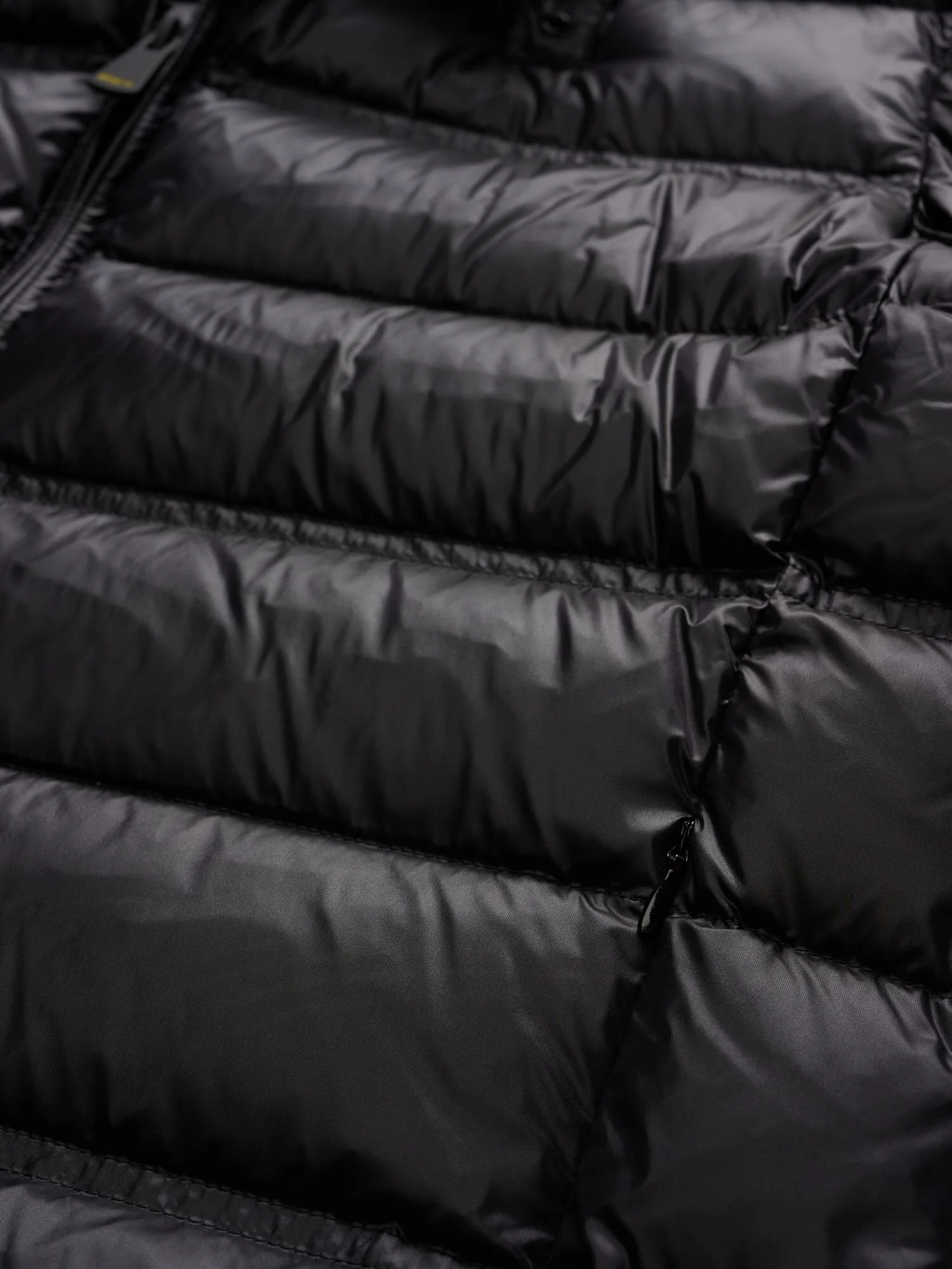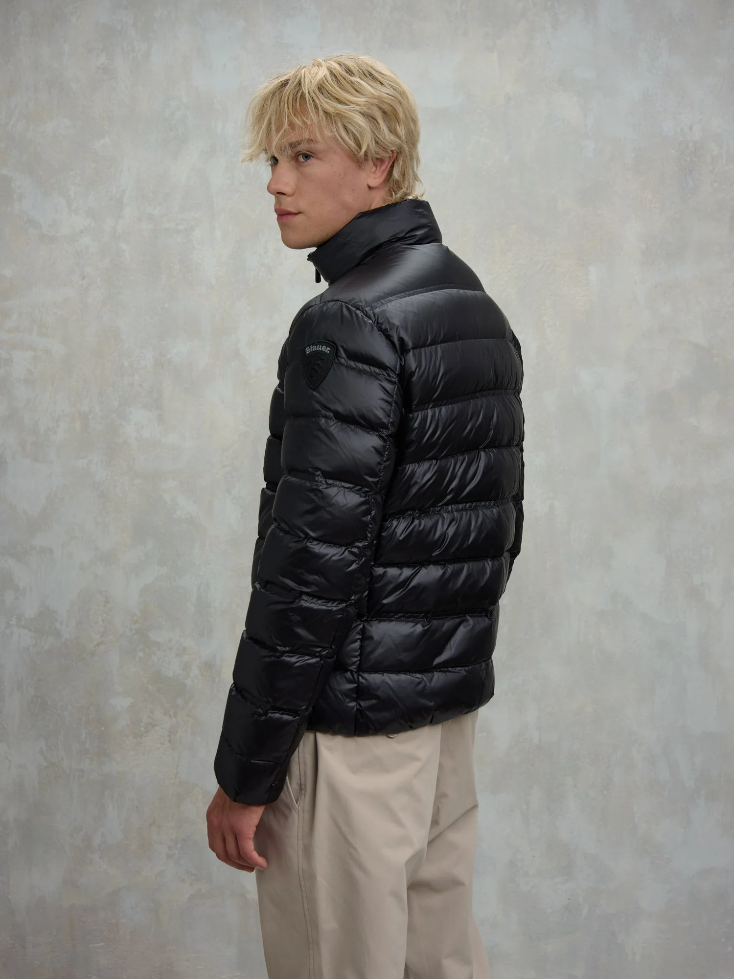 Giacca piumino senza cappuccio uomo Blauer, modello Belmont, collo alla coreana, chiusura con zip a scomparsa, tasche ai fianchi con zip, imbottitura in piuma naturale 185gr., impure orizzontali, identificativo passante e patch Blauer, elastico sul fondo vita, polsini con elastico, interno foderato in tinta con tasche, vestibilità regolare, si consiglia l'acquisto della taglia solita, tessuto 100% nylon.