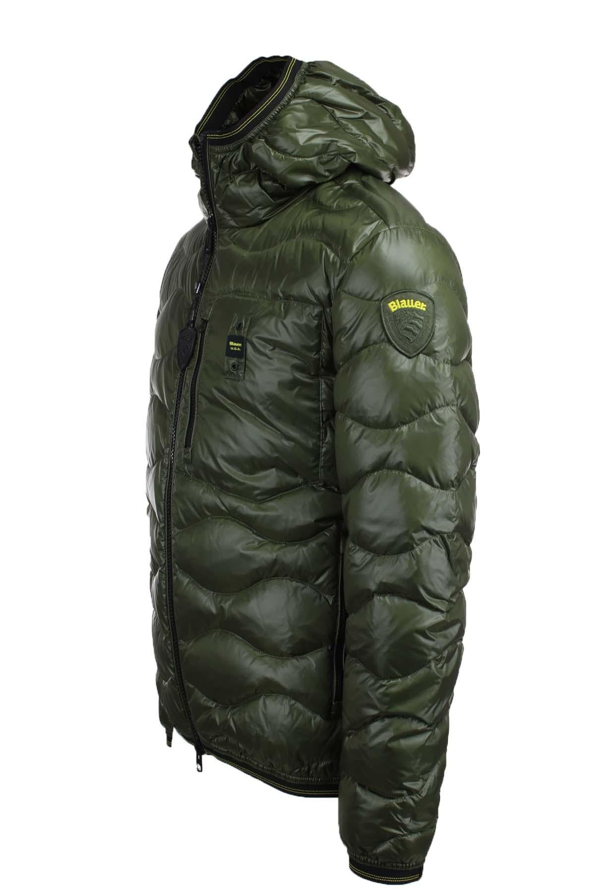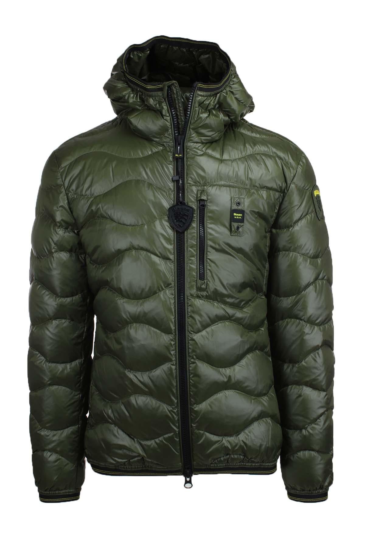 Piumino uomo Blauer, realizzato in nylon, imbottitura in piuma leggera 165 gr. caldo e poco ingombrante, impunturato a onde, cappuccio fisso, taschino con zip sul petto, chiusura con zip, tasche ai fianchi con zip, polsini e fondo vita con fettuccia elastica per una migliore vestibilità, passante e patch Blauer, interno foderato in tinta con tasche, capo iconico della collezione Blauer, vestibilità regolare.