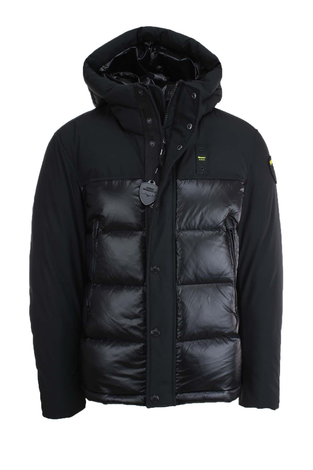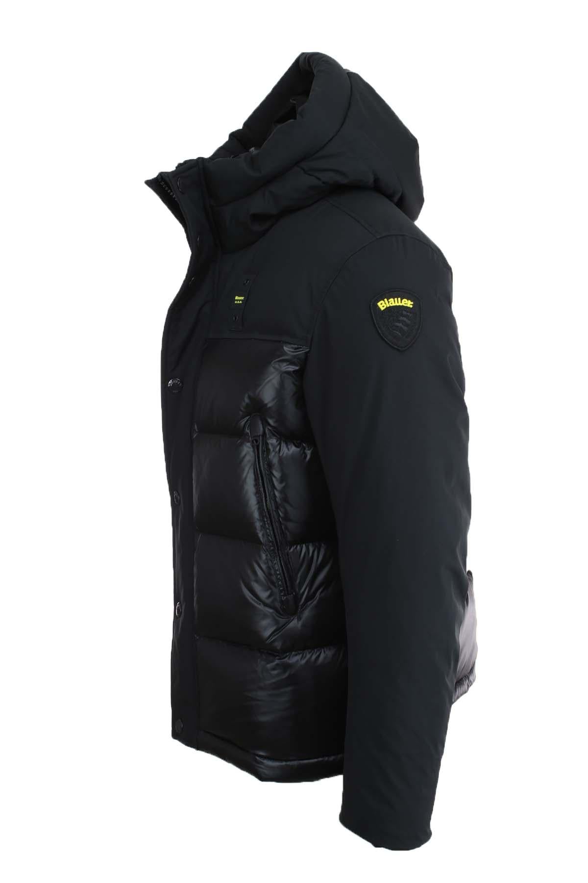 Piumino uomo Blauer realizzato in nylon e neoprene per un effetto lucido e opaco, questo piumino è la sintesi dello stile e della vestibilità Blauer, ideale per affrontare il grande freddo, ha la chiusura con zip doppio cursore nascosta da doppia pattina e bottoni automatici rinforzati da dettaglio di fettuccia in tono, passante Blauer sul petto, patch sul braccio, tasche anteriori ai fianchi con zip nascoste, interno foderato in tinta con tasche, coulisse sul fondo, nel bordo cappuccio e nel retro, imbottitura 90% anatra bianca, 10% piuma, peso 275gr.