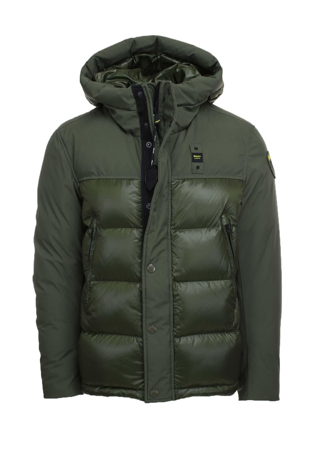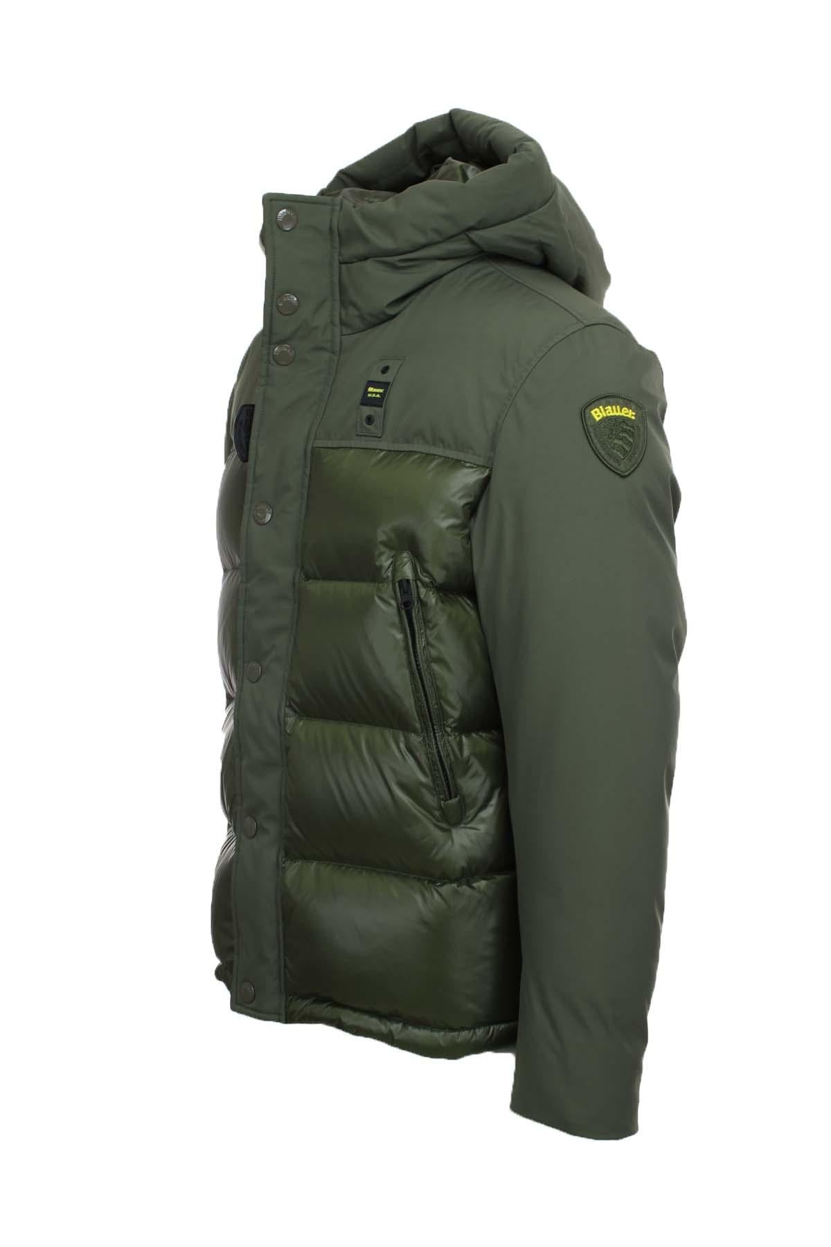 Piumino uomo Blauer realizzato in nylon e neoprene per un effetto lucido e opaco, questo piumino è la sintesi dello stile e della vestibilità Blauer, ideale per affrontare il grande freddo, ha la chiusura con zip doppio cursore nascosta da doppia pattina e bottoni automatici rinforzati da dettaglio di fettuccia in tono, passante Blauer sul petto, patch sul braccio, tasche anteriori ai fianchi con zip nascoste, interno foderato in tinta con tasche, coulisse sul fondo, nel bordo cappuccio e nel retro, imbottitura 90% anatra bianca, 10% piuma, peso 275gr.