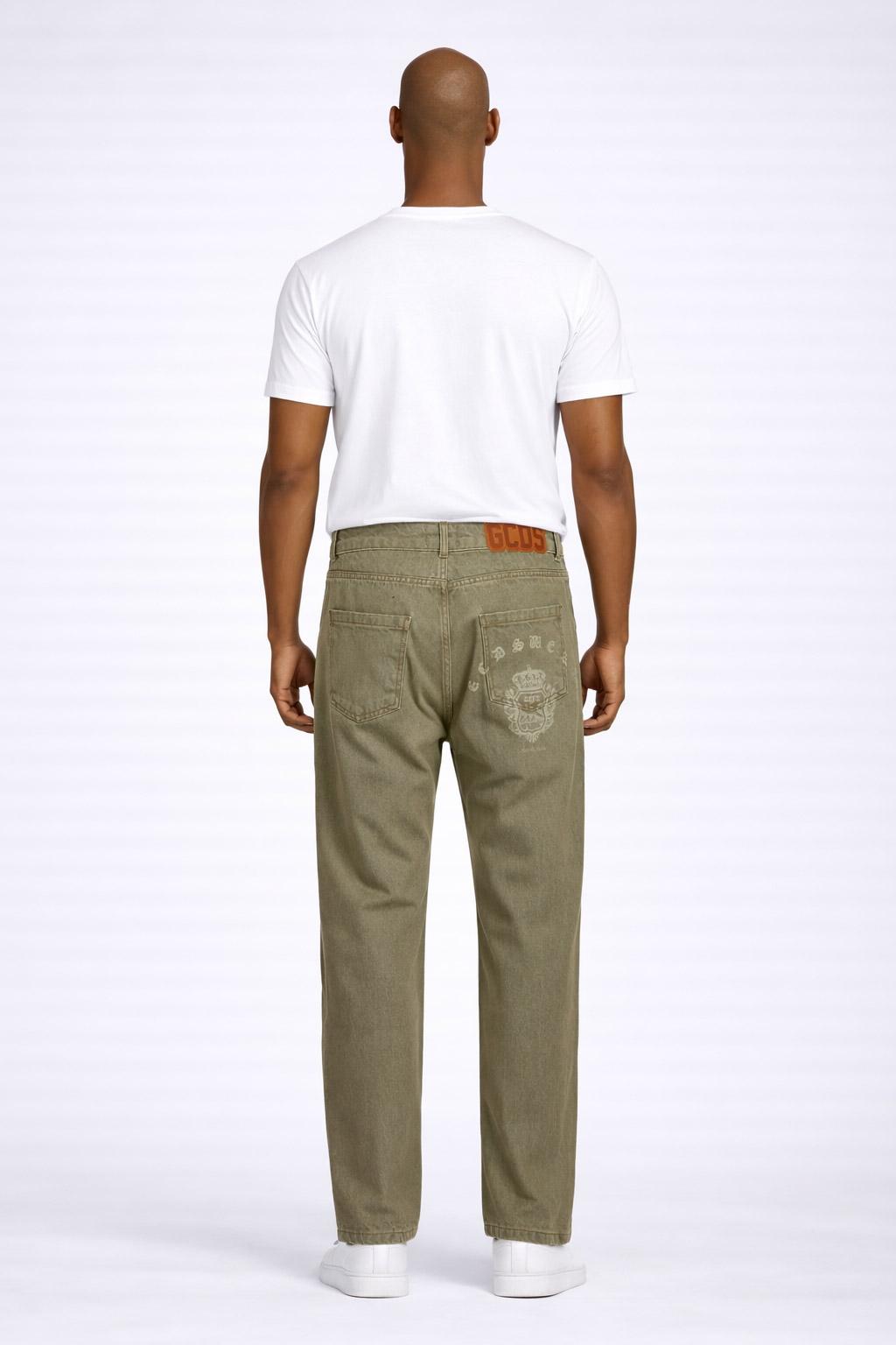 Jeans 5 tasche GCDS da uomo realizzati in denim con stampa stemma Carrot sulla tasca posteriore. Il modello presenta chiusura con zip e bottone con borchie color argento e dettaglio etichetta logata sul retro della cintura. Vestibilità regolare per un look denim deciso e contemporaneo.