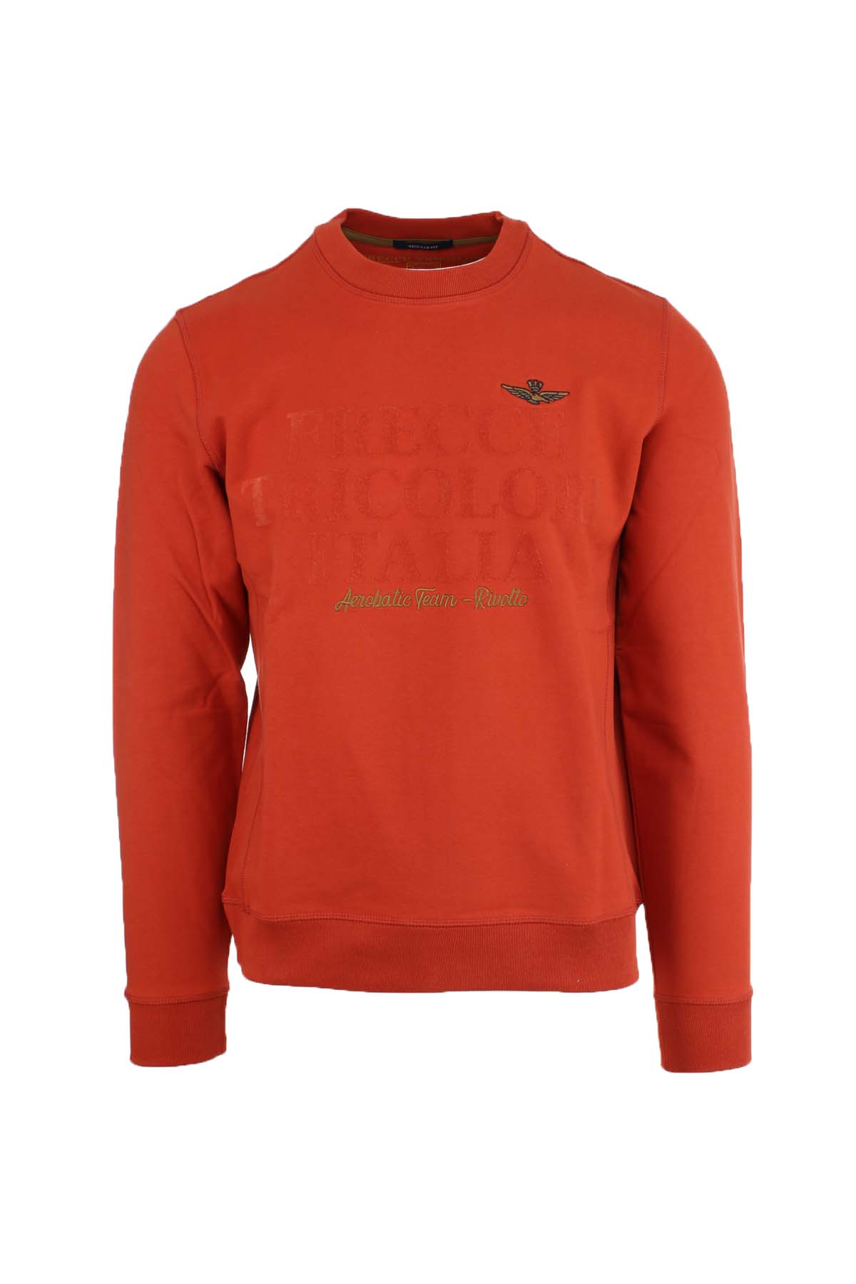Felpa girocollo uomo Frecce Tricolori Italia, realizzata in morbido cotone, stampa vellutata in tinta sul davanti, Logo Aeronautica Militare, polsini e fondo vita in costina elastica, vestibilità regolare, 95% cotone, 5% elastan.