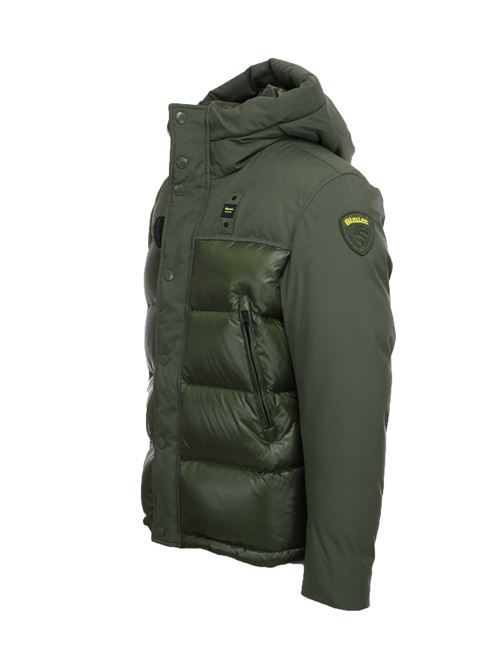 Piumino uomo Blauer realizzato in nylon e neoprene per un effetto lucido e opaco, questo piumino è la sintesi dello stile e della vestibilità Blauer, ideale per affrontare il grande freddo, ha la chiusura con zip doppio cursore nascosta da doppia pattina e bottoni automatici rinforzati da dettaglio di fettuccia in tono, passante Blauer sul petto, patch sul braccio, tasche anteriori ai fianchi con zip nascoste, interno foderato in tinta con tasche, coulisse sul fondo, nel bordo cappuccio e nel retro, imbottitura 90% anatra bianca, 10% piuma, peso 275gr.