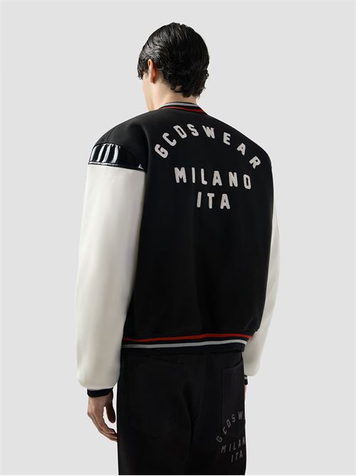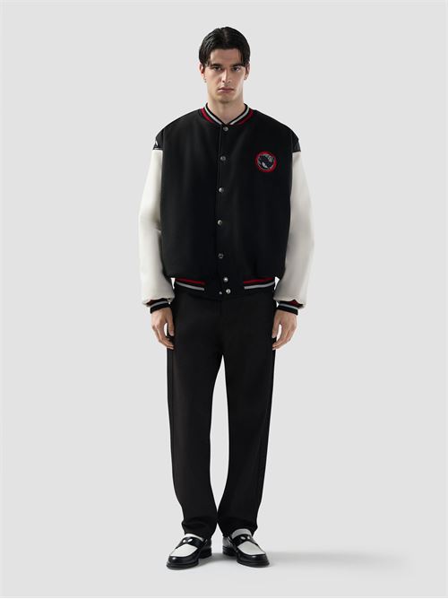 Giubbotto bomber GCDS Varsity con patch Kittho, chiusura con bottoni a pressione, polsini e fondo vita in maglina elasticizzata a righe, tasche ai fianchi, vestibilità regolare, 100% poliestere.