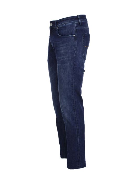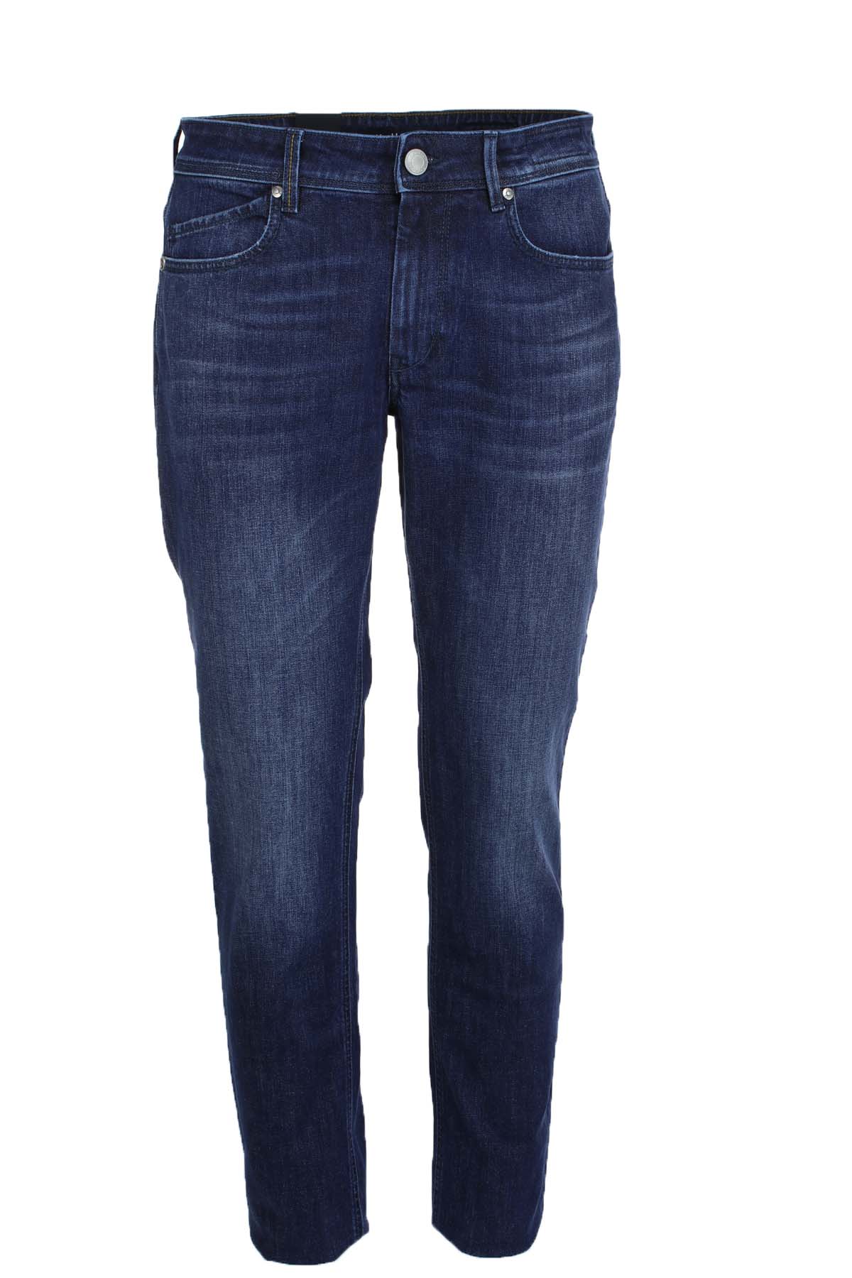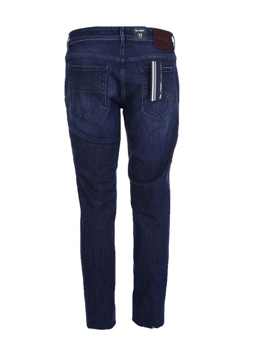 Jeans uomo 5 tasche firmato Re-Hash, realizzato in pregiato tessuto denim lavaggio scuro, chiusura con zip, borchie in metallo personalizzati, vestibilità regolare, 98% cotone, 2% elastan, Made in Italy.