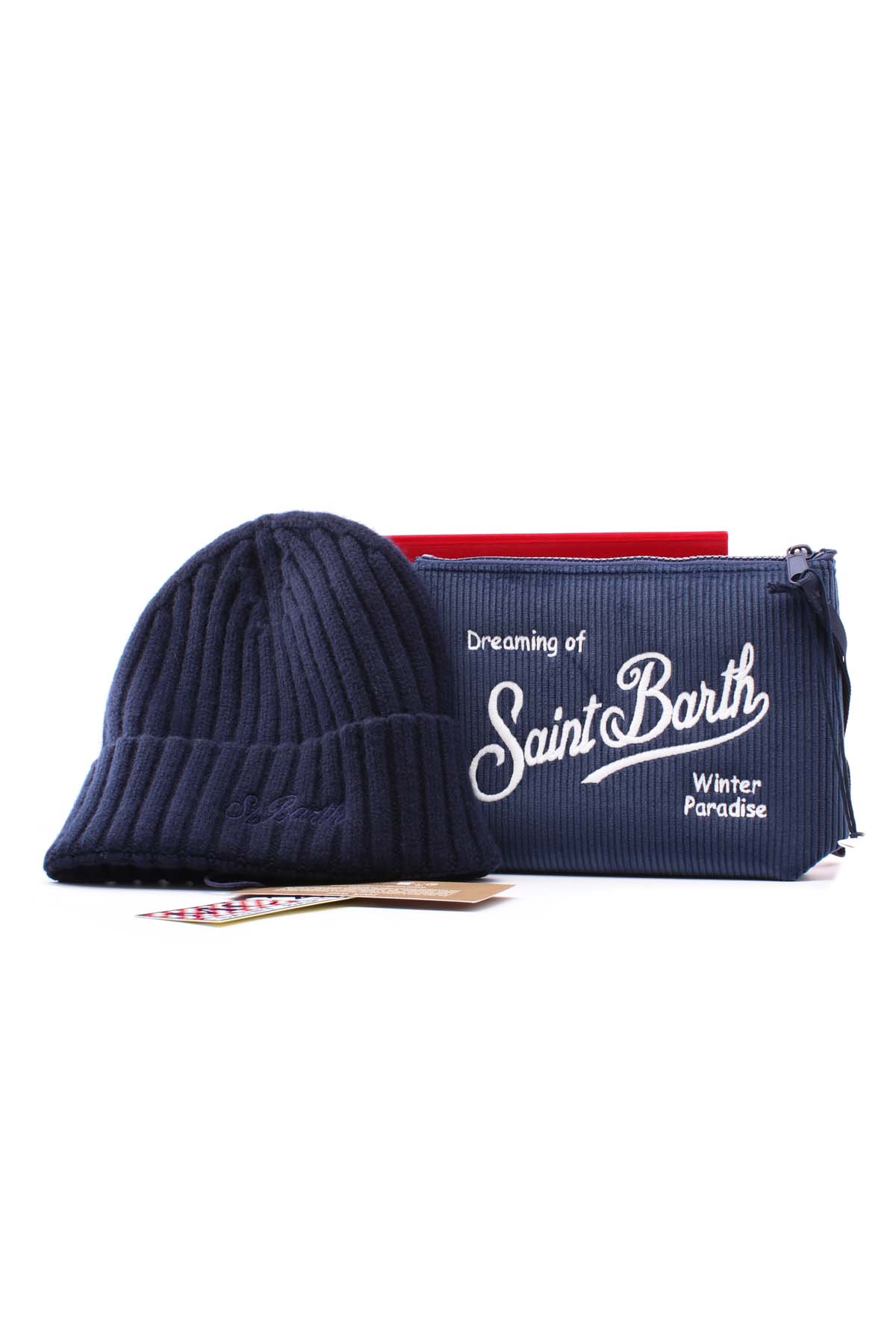 Confezione regalo composta da cappellino in lana con logo Saint Barth e Pochette Tartan, racchiusi nell'elegante scatola in velluto rosso per un regalo unico, originale, gradito.