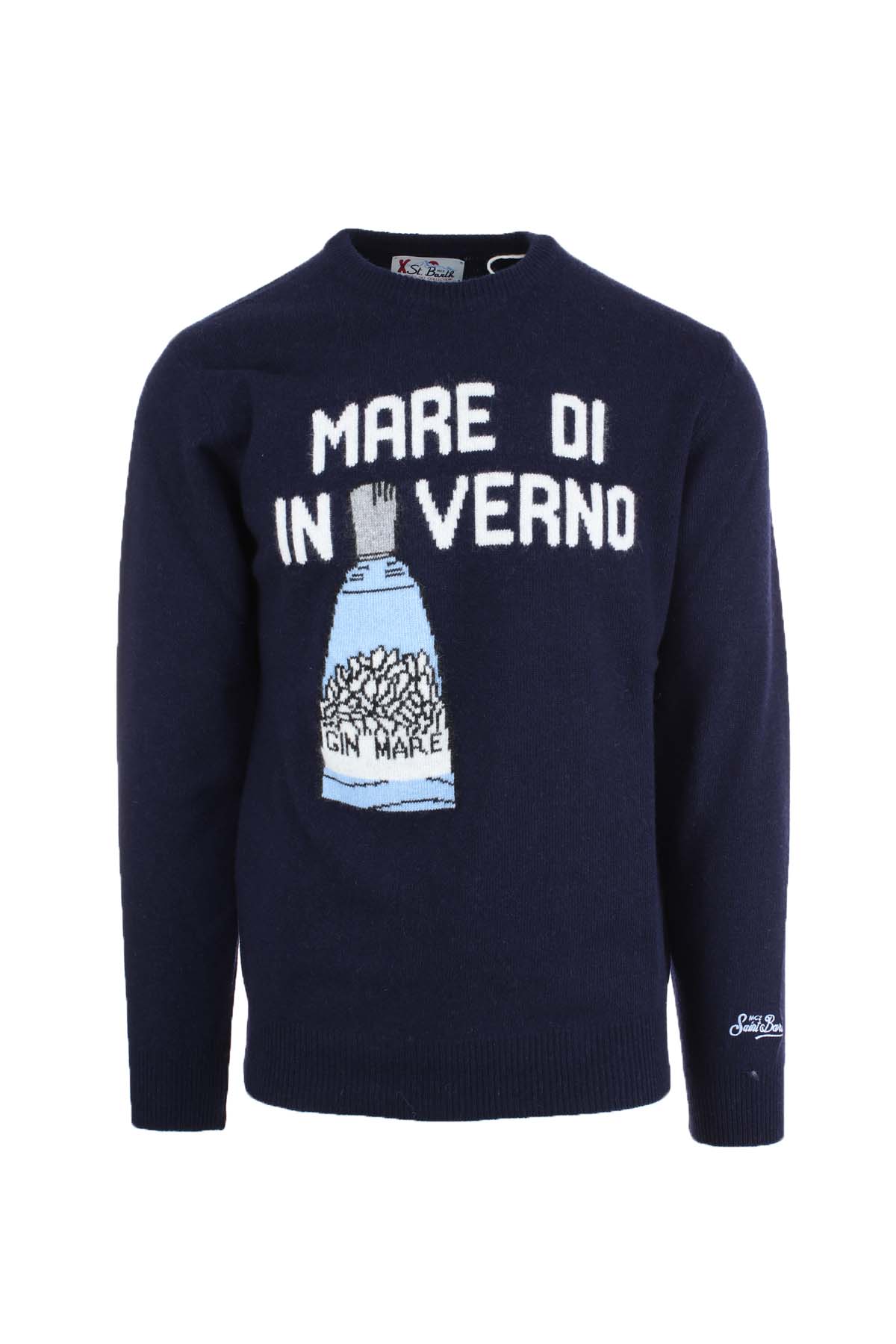 Maglia pullover girocollo uomo realizzata in morbida lana e cachemire, polsini e vita in maglina elasticizzata, Logo Saint Barth, vestibilità regular fit, 40% lana 25% viscosa 10% cachemire 25% poliammide.