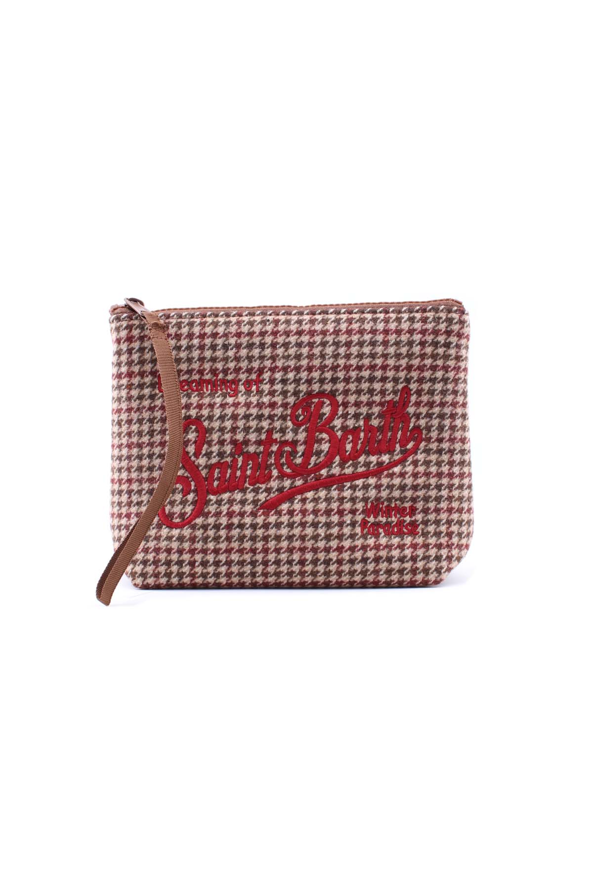 Pochette Aline fantasia pied de poule firmata Saint Barth MC2. Portala sempre con te, simpatica, comoda elegante, in mille fantasie e colori, realizzata in neoprene stampato, zip e laccetto per il trasporto a mano, usala anche come scomparto aggiuntivo della tua borsa, non uscire più senza di lei. Misure 21 x 15 x 7 cm.