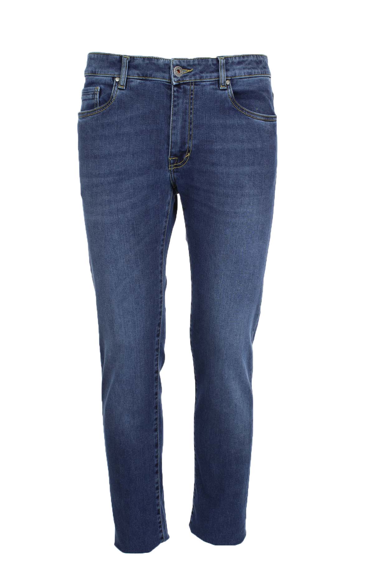 Jeans denim 5 tasche uomo Teleria Zed, realizzato in denim elasticizzato, chiusura con zip e bottone in metallo, vestibilità slim fit, lavaggio medio, cuciture oro, 98% cotone, 2% elastan.