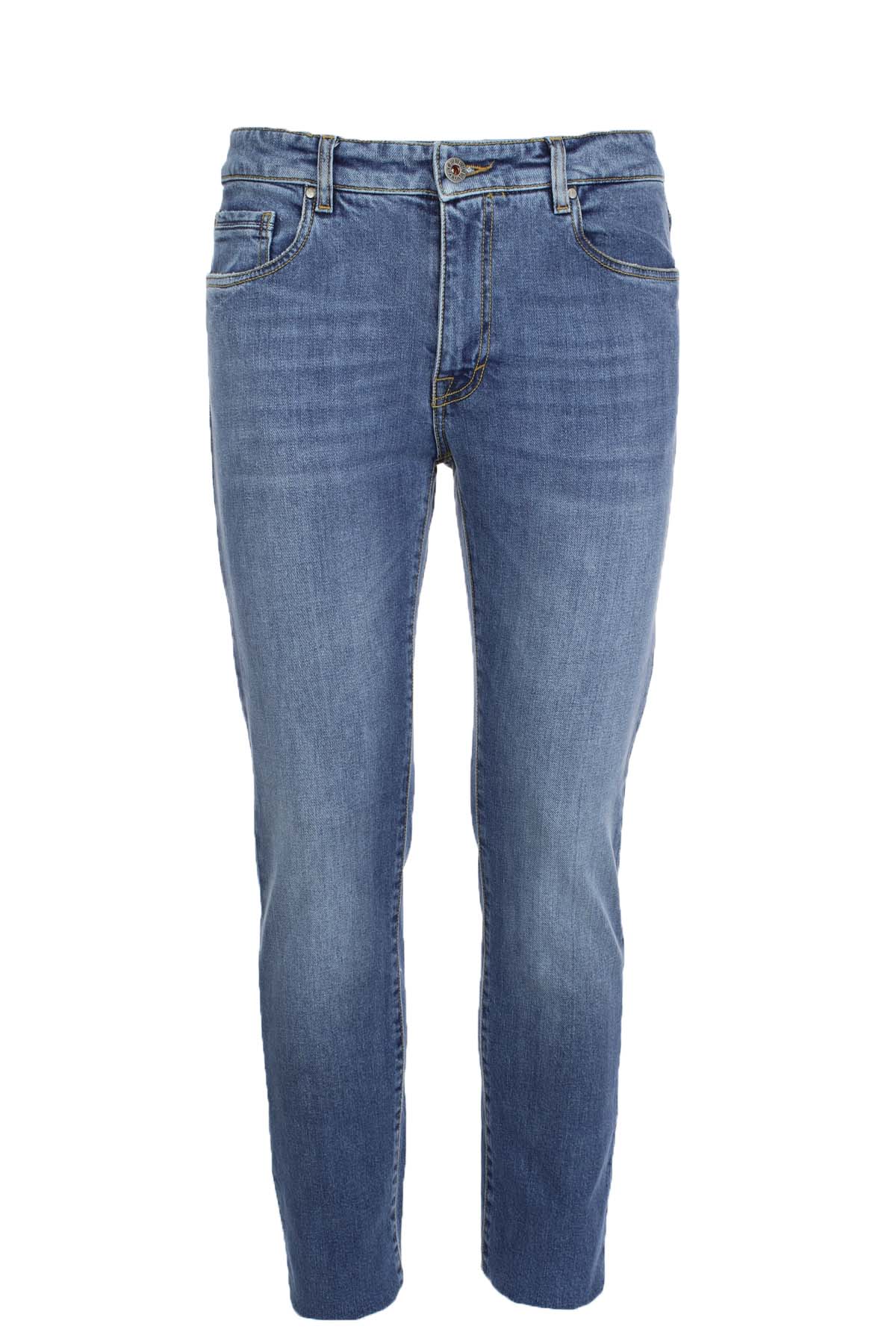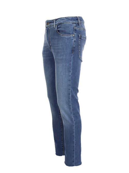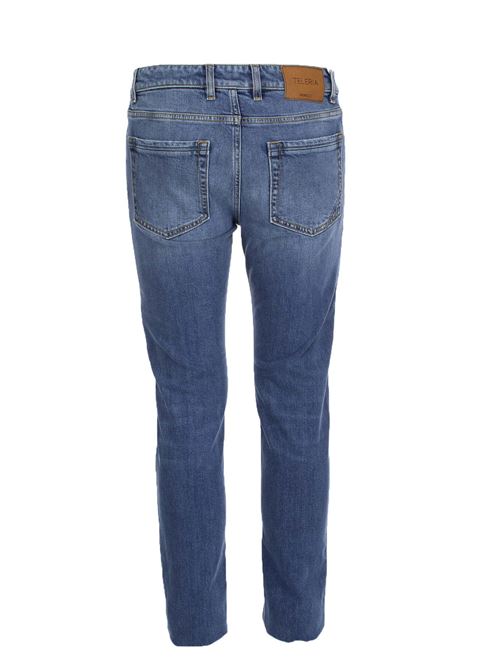 Jeans denim 5 tasche uomo Teleria Zed, realizzato in denim elasticizzato, chiusura con zip e bottone in metallo, vestibilità slim fit, lavaggio medio, cuciture oro, 98% cotone, 2% elastan.